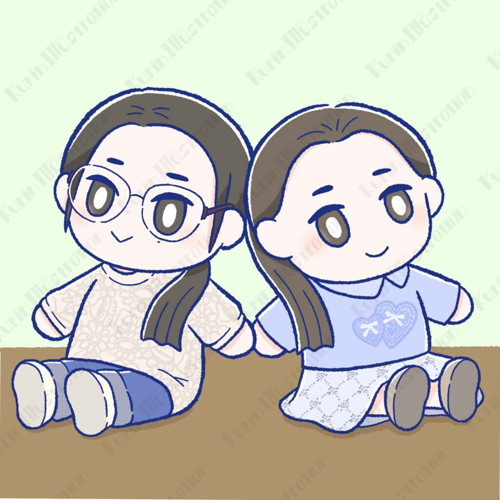 お子さん2人をぬいぐるみ風に描いたイラストと、