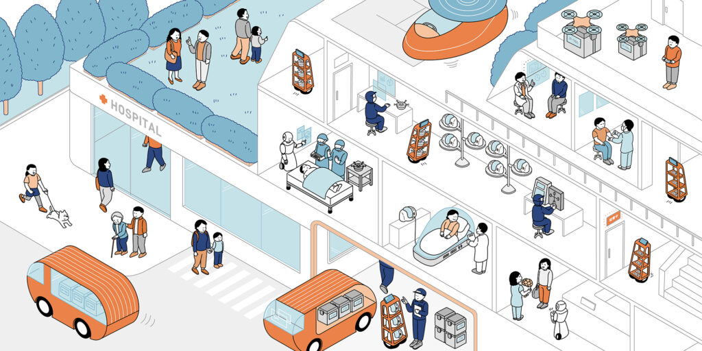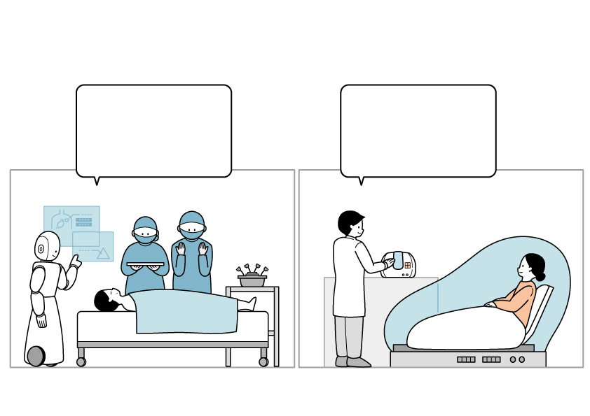 キービジュアルでは、医療現場で商品が使用される様子をアイソメトリック図の技法で描いています。