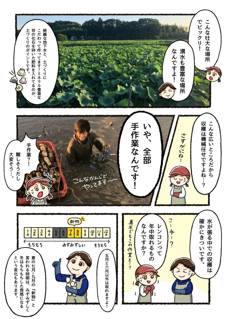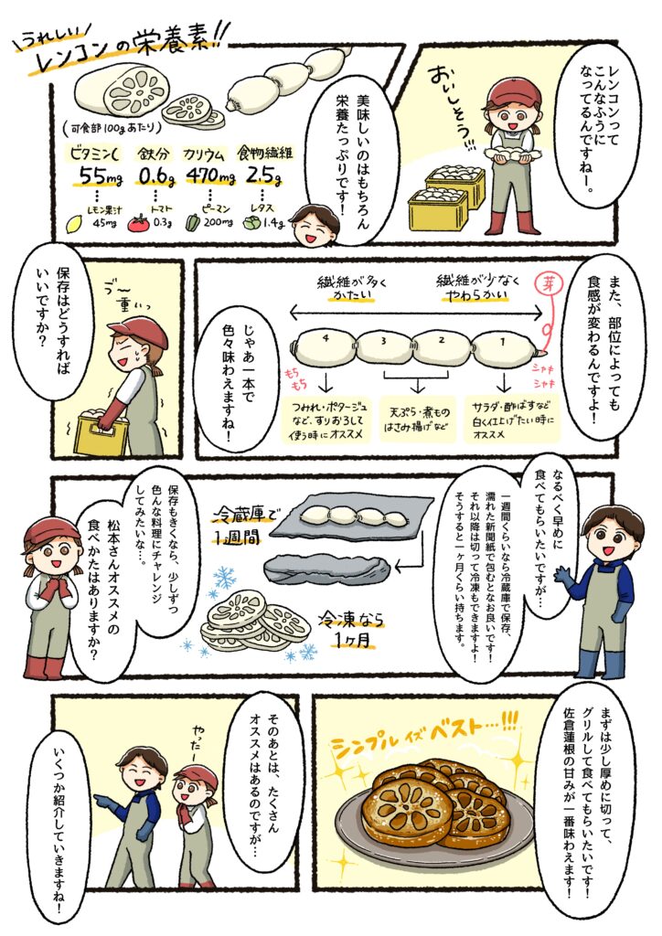 レンコンの栄養素・保存方法などを、漫画で紹介しています。