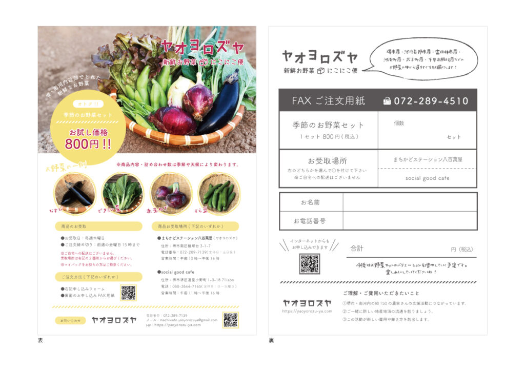 「大阪府の堺市や南河内近郊でとれた新鮮なお野菜を沢山の方々にお届けしたい」という目的で始められた配達サービスの宣伝チラシです。